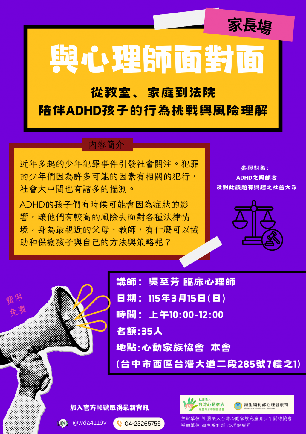 | 主題:從教室、家庭到法院-陪伴ADHD孩子的行為挑戰與風險理解 |