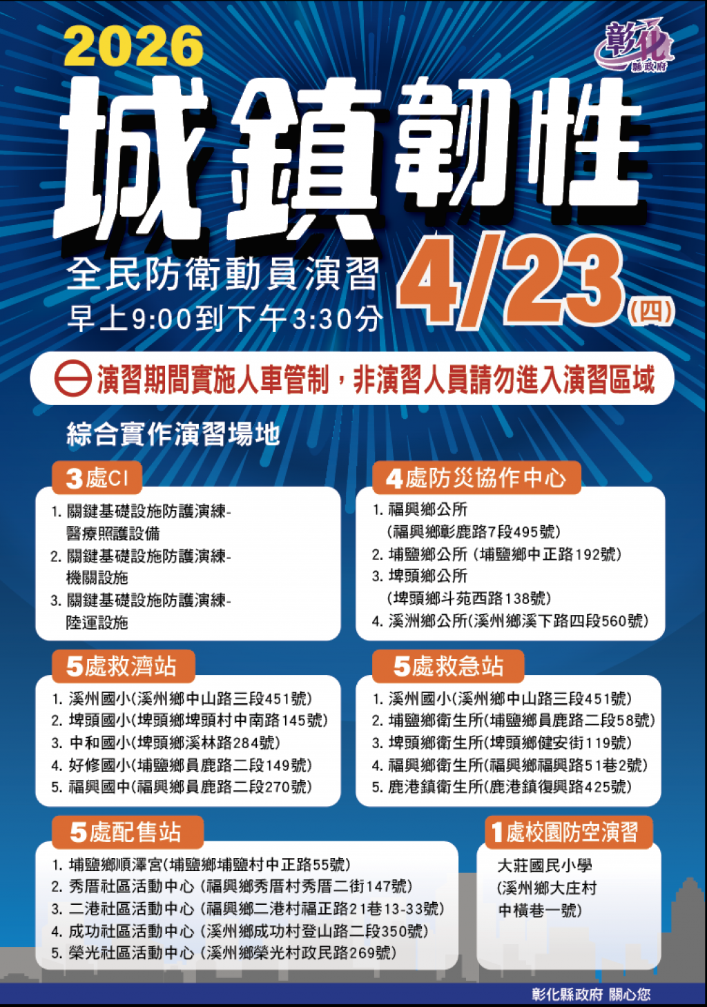 (一)文字宣傳內容如下:彰化縣政府謹訂於115年4月23日(星期四)於福興鄉、埔鹽鄉、埤頭鄉、溪州鄉等4個鄉(鎮、市)辦理彰化縣2026城鎮韌性(全民防衛動員)演習。