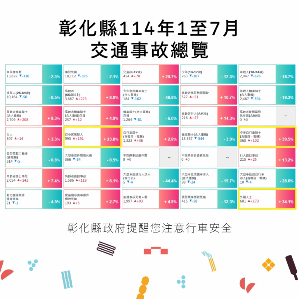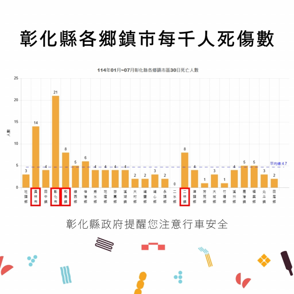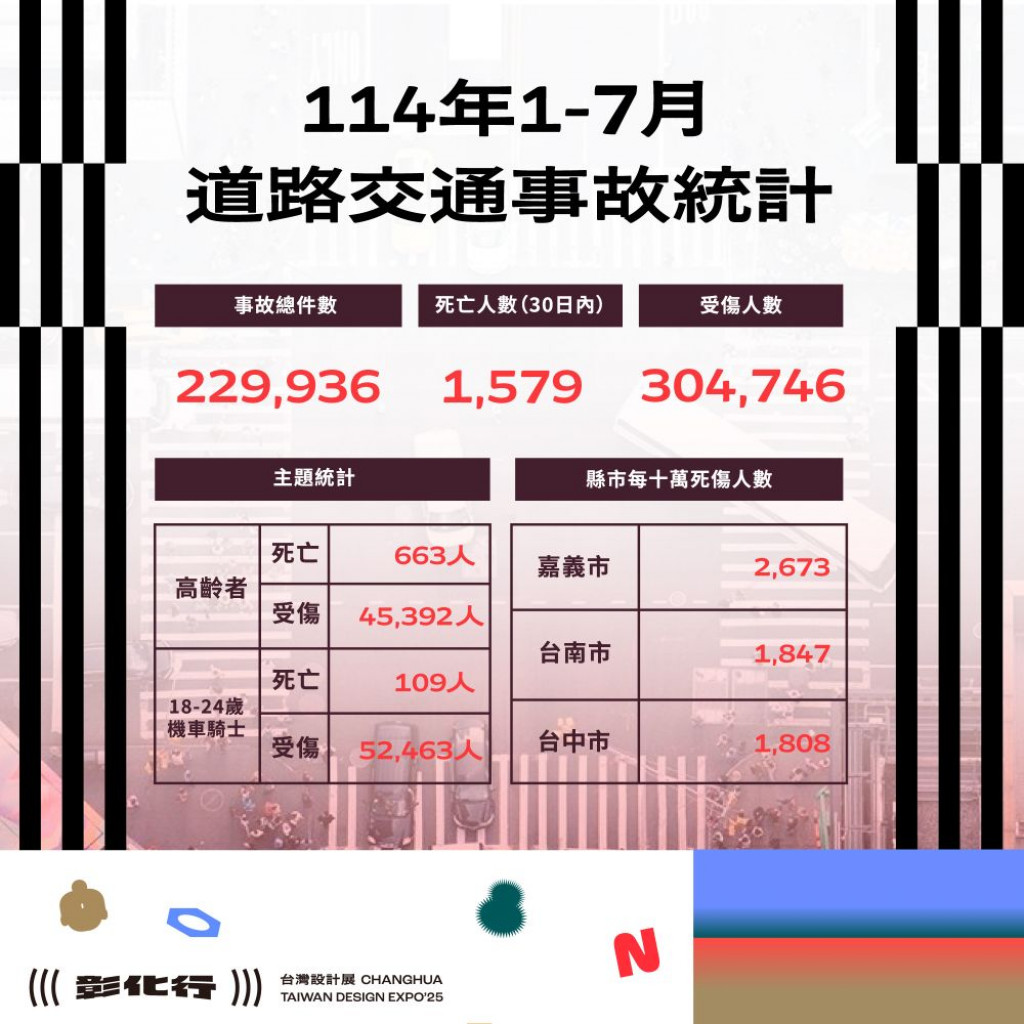五、附件為「114年1-7月全國道路交通事故統計、彰化縣交通事故總覽、本縣各鄉鎮市每千人死傷人數及肇事熱點」共4份統計資料宣導圖,社群宣導內容可參閱或分享本處「花現彰化-2025台灣設計展」https://www.facebook.com/chcginformation)臉書粉絲專頁。