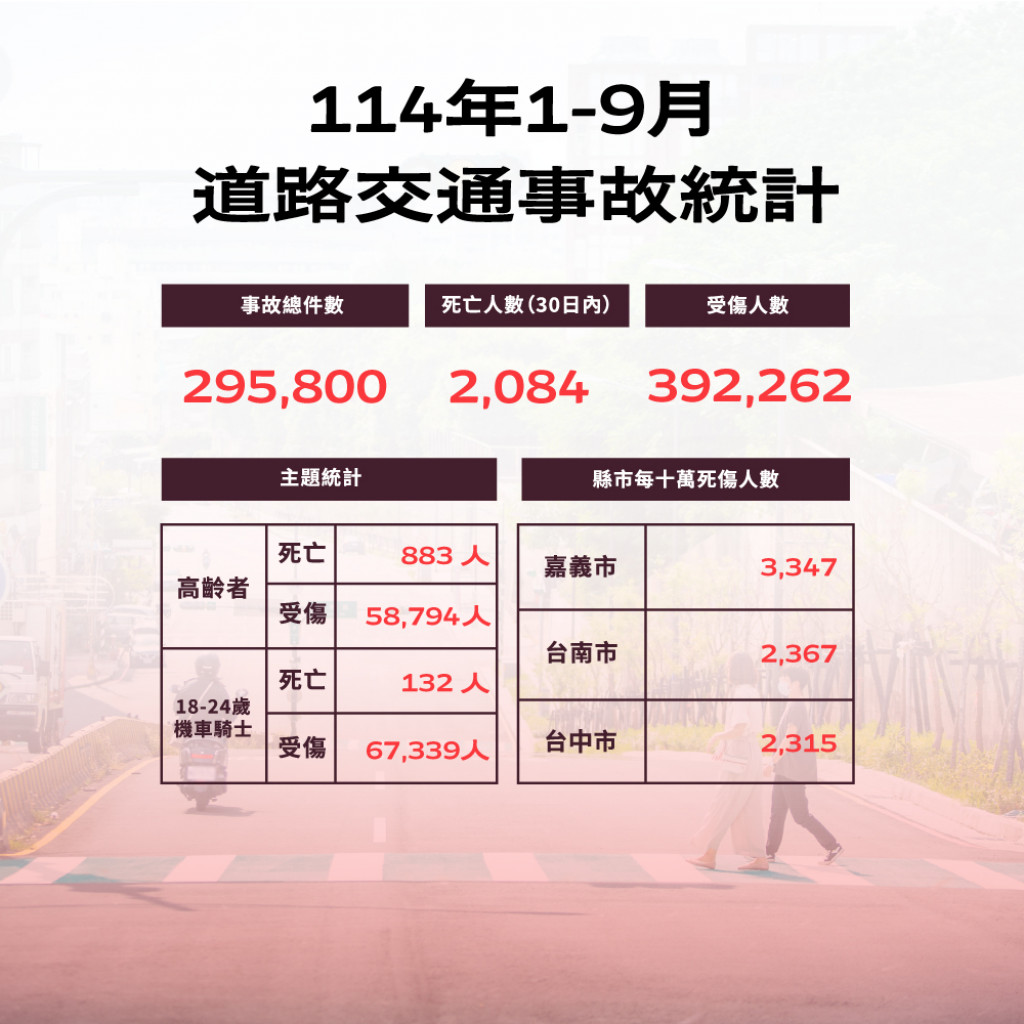 五、附件為「114年1-9月全國道路交通事故統計、彰化縣交通事故死傷人數增加排行、本縣各鄉鎮市30日死亡人數、肇事熱點及交通事故肇因統計」共5份統計資料宣導圖,社群宣導內容可參閱或分享本處「花現彰化-彰化縣政府新聞處」(https://pse.is/8h44cp)臉書粉絲專頁,相關宣導圖片素材請參閱:https://reurl.cc/DbyGR5。