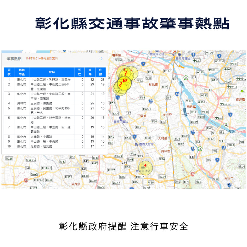 二、根據交通部道安資訊查詢網,本縣114年1-9月道路交通事故與112年同期比較分析,以少年自行車騎士(含電自、電輔) 事故增加45%最高,外籍人士事故增加34.3%次之,自小客車駕駛人增加26%再次之。1-9月份鄉鎮市30日死亡人數於「彰化市、員林市、二林鎮」為多,肇事熱點以「彰化市」為多,合先敘明。